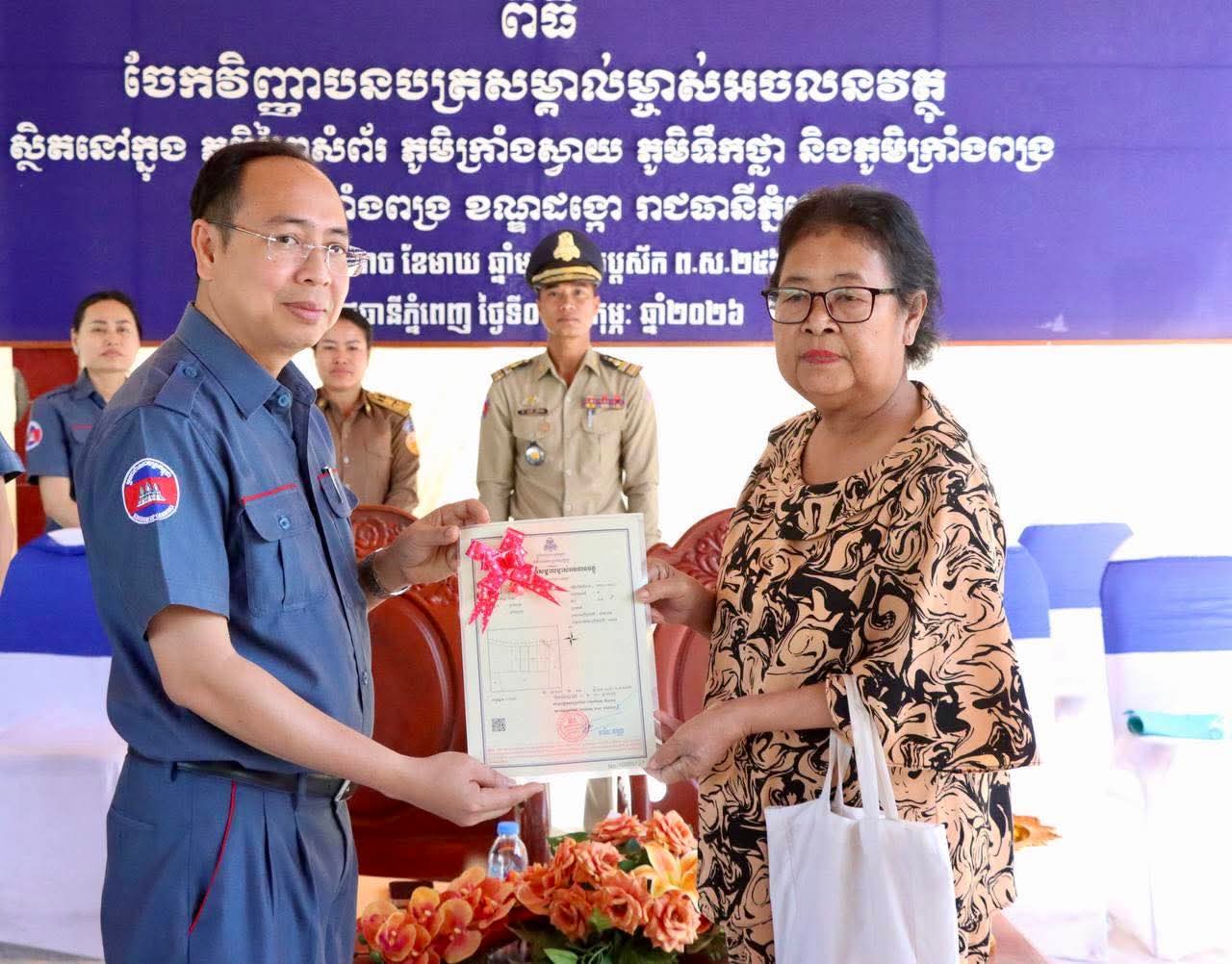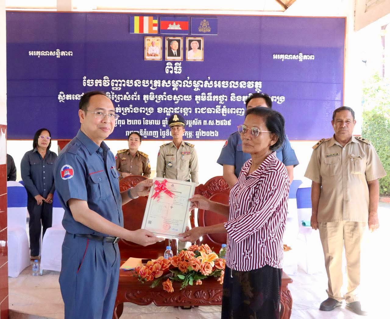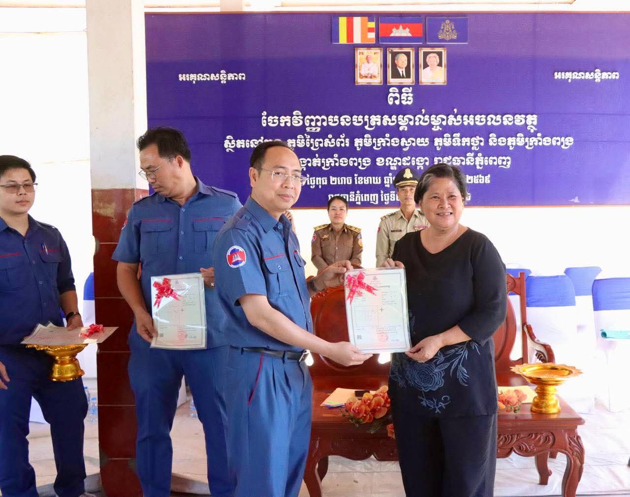 @:ខណ្ឌដង្កោ@: លោកស្រី គឹម ញឹប អភិបាល នៃគណៈអភិបាលខណ្ឌដង្កោ តំណាងដ៏ខ្ពង់ខ្ពស់ឯកឧត្តម ឃួង ស្រេង អភិបាល នៃគណៈអភិបាលរាជធានីភ្នំពេញ និងលោក ប៊ិន សូឈី អនុប្រធានមន្ទីររៀបចំដែនដីនគរូបនីយកម្ម និងសំណង់ រាជធានីភ្នំពេញ អញ្ជើញចូលរួមជាគណៈអធិបតី ក្នុងពិធីចែកវិញ្ញាបនបត្រសម្គាល់ម្ចាស់អចលនវត្ថុស្ថិតនៅក្នុងភូមិព្រៃសំព័រ ភូមិក្រាំងស្វាយ ភូមិទឹកថ្លា និងភូមិក្រាំងពង្រ សង្កាត់ក្រាំងពង្រ ខណ្ឌដង្កោ រាជធានីភ្នំពេញ។