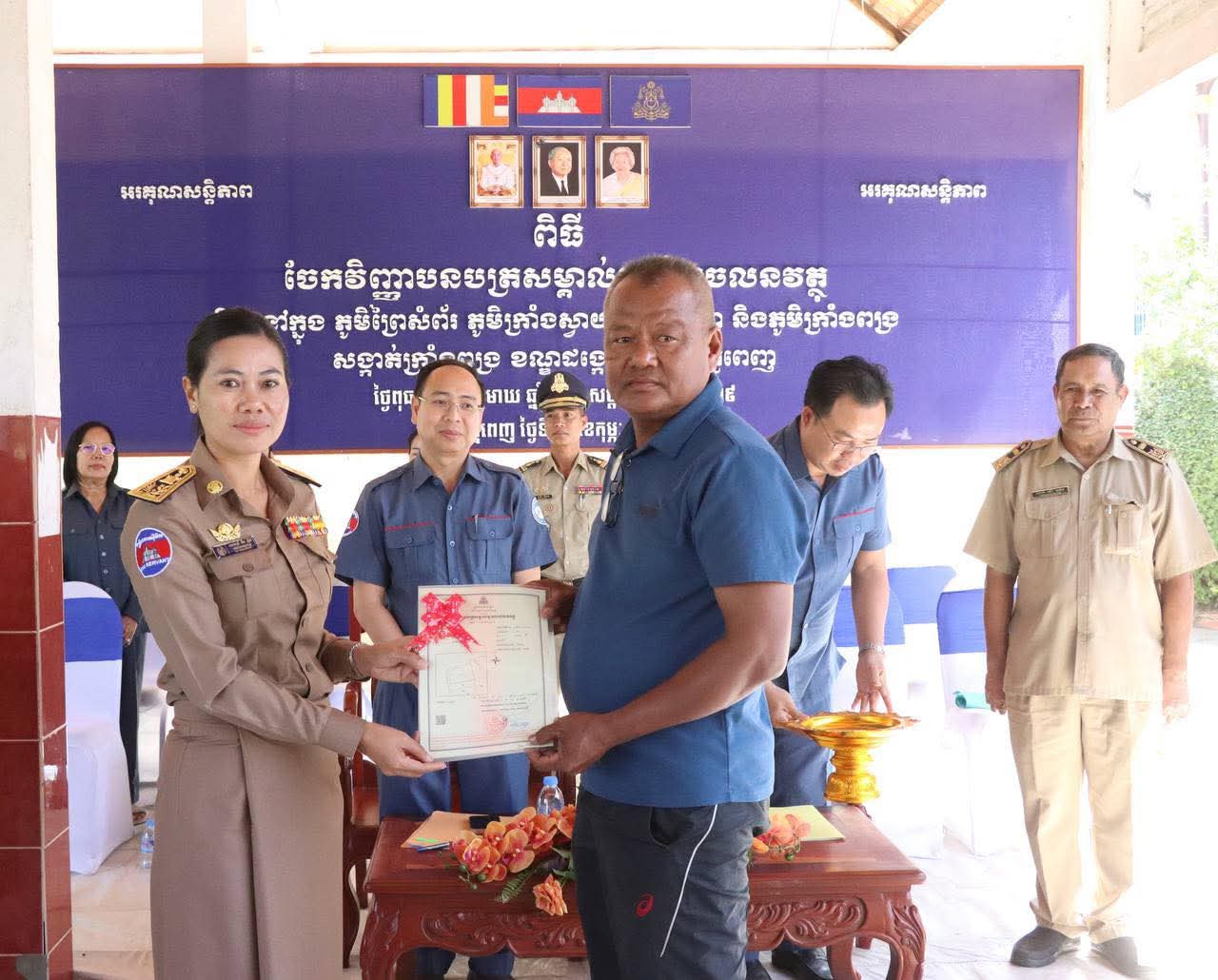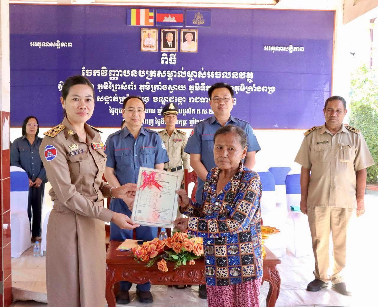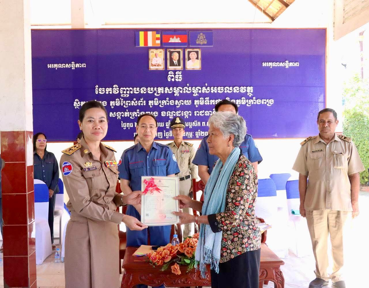 @:ខណ្ឌដង្កោ@: លោកស្រី គឹម ញឹប អភិបាល នៃគណៈអភិបាលខណ្ឌដង្កោ តំណាងដ៏ខ្ពង់ខ្ពស់ឯកឧត្តម ឃួង ស្រេង អភិបាល នៃគណៈអភិបាលរាជធានីភ្នំពេញ និងលោក ប៊ិន សូឈី អនុប្រធានមន្ទីររៀបចំដែនដីនគរូបនីយកម្ម និងសំណង់ រាជធានីភ្នំពេញ អញ្ជើញចូលរួមជាគណៈអធិបតី ក្នុងពិធីចែកវិញ្ញាបនបត្រសម្គាល់ម្ចាស់អចលនវត្ថុស្ថិតនៅក្នុងភូមិព្រៃសំព័រ ភូមិក្រាំងស្វាយ ភូមិទឹកថ្លា និងភូមិក្រាំងពង្រ សង្កាត់ក្រាំងពង្រ ខណ្ឌដង្កោ រាជធានីភ្នំពេញ។