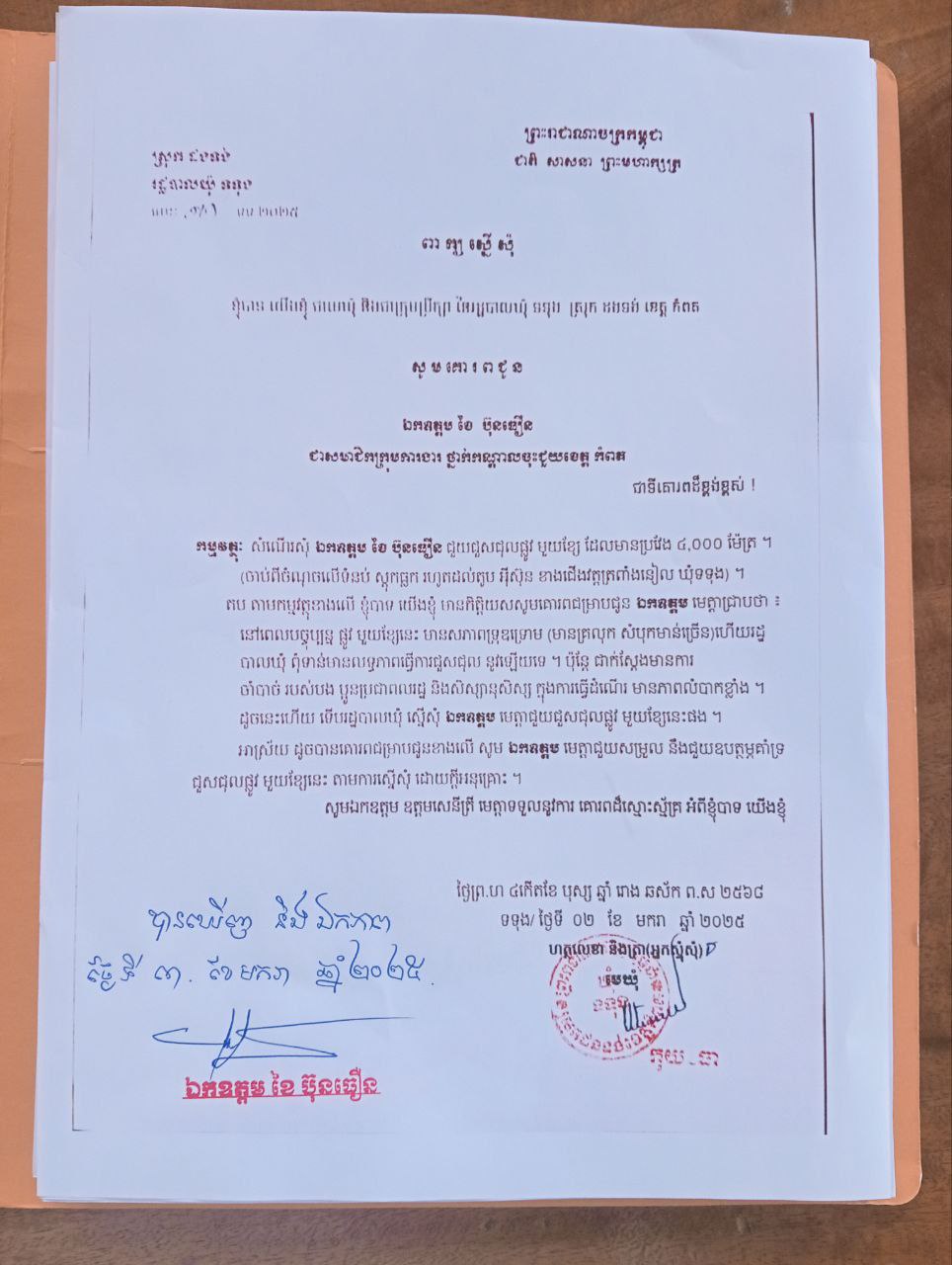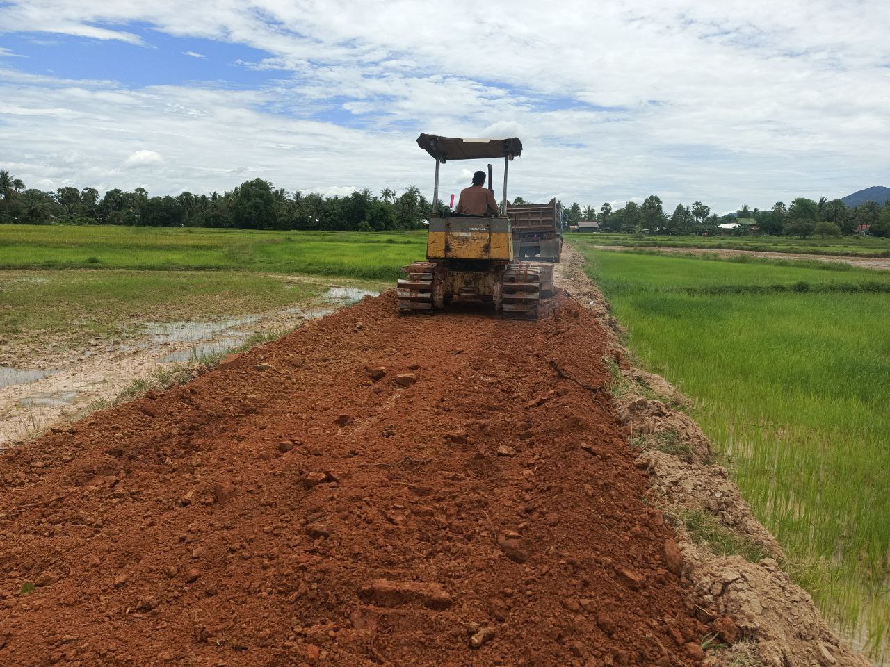 ខេត្តកំពត@.ដើម្បីឆ្លើយតបនឹងសំណូមពរដ៏ចាំបាច់របស់ប្រជាពលរដ្ឋរស់នៅក្នុងឃុំទទុង ស្រុក ដងទុង ខេត្តកំពត ឯកឧត្តម ខៃ ប៊ុនធឿន សមាជិកក្រុមការងារថ្នាក់កណ្តាលចុះជួយខេត្តកំពត និងសហការី រួមជាមួយអាជ្ញាធរឃុំ បានដាក់គ្រឿងចក្រជួលជុលផ្លូវលំមួយខ្សែ ប្រវែង៤០០០ម៉ែត្រ ចាប់ពីចំនុចលើទំនប់ស្តុកធ្លក រហូតដល់តូបអ៊ីស៊ុន ខាងជើងវត្តត្រពាំងនៀល ឃុំទទុង ស្រុកដងទុង ខេត្តកំពត ដោយបច្ចុប្បន្ន ផ្លូវលំមួយខ្សែនេះ មានសភាពទ្រុឌទ្រោម (មានគ្រលុកសំបុកមាន់ច្រើន) ហើយពិបាកជាខ្លាំងក្នុងការធ្វើដំណើរ របស់បងប្អូនប្រជាពលរដ្ឋសម្រាប់ដឹកសមិទ្ធផលនានាៗទៅរកទីផ្សារជាពិសេសក្នុងការធ្វើដំណើររបស់ក្មួយៗសិស្សានុសិស្សទៅសាលារៀន។