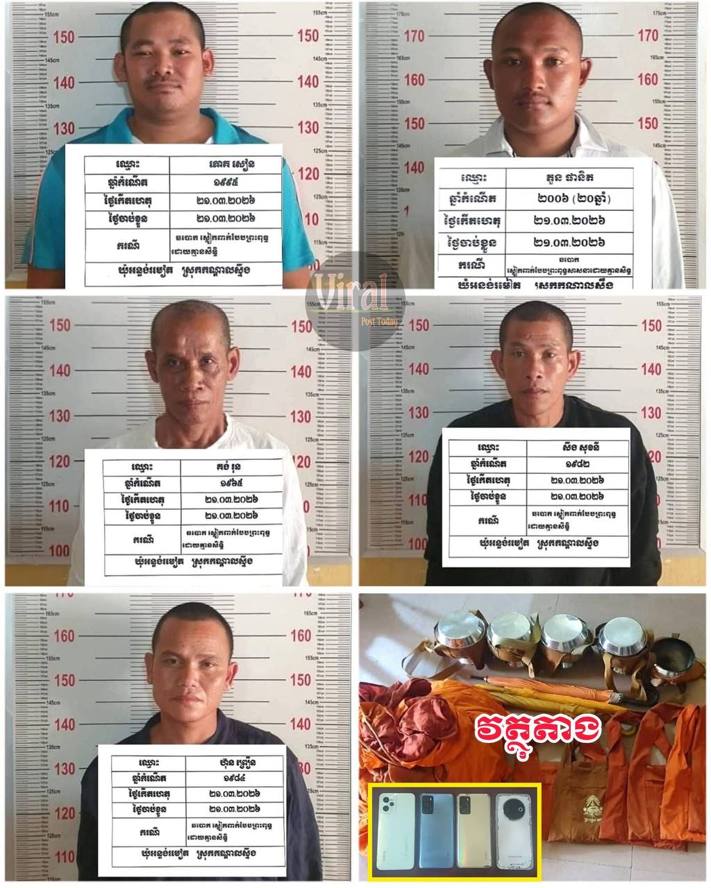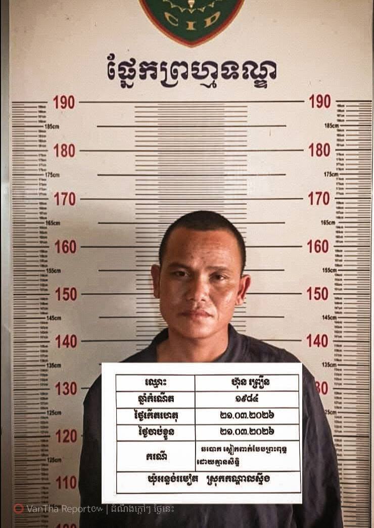 នៅថ្ងៃទី២១ ខែមីនា ឆ្នាំ២០២៦ វេលាម៉ោង០៧:៤០នាទី ជនសង្ស័យឈ្មោះហ៊ុន ព្រឿន ឈ្មោះសឹង សុខនី និងជនសង្ស័យឈ្មោះឡាន់ ឌីណា បាននាំគ្នាដើរបិណ្ឌបាត នៅម្តុំមុខវត្ថអន្លង់រមៀត ស្ថិតក្នុងភូមិដើមត្រាំង ឃុំអន្លង់រមៀត រួចបានបន្តដើរមកបិណ្ឌបាតនៅម្តុំផ្សារកំពុងកន្ទួត ឃុំបារគូ លុះមកដល់វេលាម៉ោង១០:០០នាទីនាថ្ងៃដដែលពេលជនសង្ស័យទាំង០៣នាក់ខាងលើ កំពុងបិណ្ឌបាតនៅម្តុំផ្សារកន្ទួត ភ្លាមនោះសមត្ថកិច្ចប៉ុស្តិ៍រដ្ឋបាលឃុំអន្លង់រមៀត បានមកឃាត់ខ្លួនជនសង្ស័យទាំង០៣នាក់ដើម្បីសាកសួរ បានសារភាពថា:ពិតជាបានស្លៀកពាក់បែបព្រះពុទ្ធសាសនា(ព្រះសង្ឃ) ដើរបិណ្ឌបាត បោកប្រជាពលរដ្ឋដើម្បីយកប្រាក់ ប្រាកដមែន ។