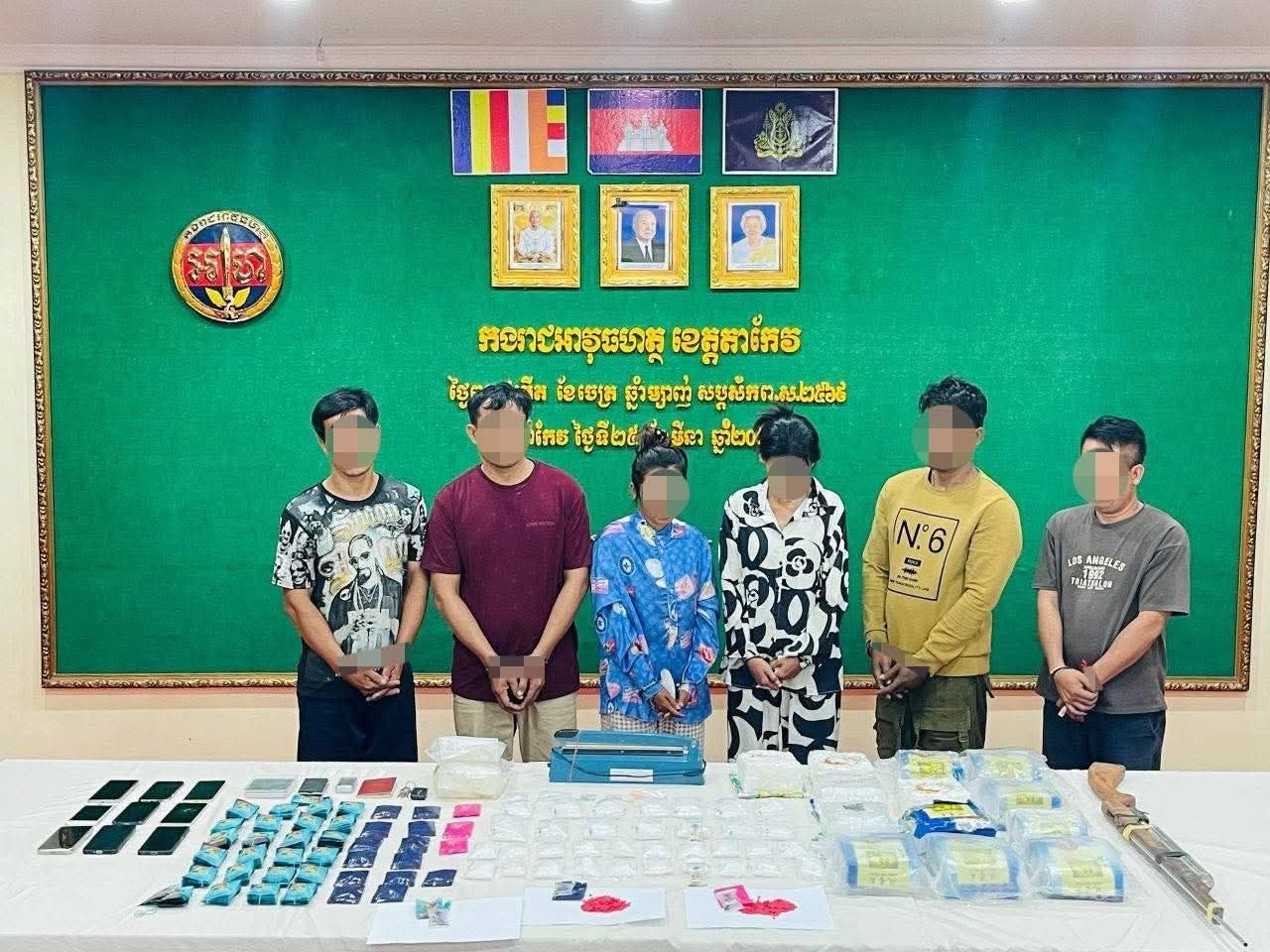 នៅវេលាម៉ោង ០៦:៤០នាទី ថ្ងៃទី២១ខែមីនា ឆ្នាំ២០២៦ កម្លាំងមន្ទីរស្រាវជ្រាវ និងបង្រ្កាបបទល្មើស ដឹកនាំដោយលោកវរសេនីយ៍ឯក កែន វណ្ណៈ មេបញ្ជាការរងកងរាជអាវុធហត្ថខេត្តតាកែវ បានចុះប្រតិបត្តិការបង្ក្រាបករណី ដឹកជញ្ជូន រក្សាទុក ជួញដូរនិងប្រើប្រាស់ដោយខុសច្បាប់នូវសារធាតុញៀន នៅភូមិមហាសេនា ឃុំតាភេម ស្រុកត្រាំកក់ ខេត្តតាកែវ និងបានបន្តពន្លាតដែនសមត្ថកិច្ចទៅរាជធានីភ្នំពេញ សហការជាមួយកម្លាំងកងរាជអាវុធហត្ថលើផ្ទៃប្រទេស និងកម្លាំងកងរាជអាវុធហត្ថរាជធានីភ្នំពេញ ដឹកនាំរួមដោយលោកវរសេនីយ៍ទោ អ៊ួង វិរៈរត្ន័មុន្នី នាយការិយាល័យប្រឆាំងគ្រឿងញៀន កងរាជអាវុធហត្ថលើផ្ទៃប្រទេស និងមានការសម្របសម្រួលនិតិវិធីដោយលោកសុីន រក្សា ព្រះរាជអាជ្ញារង អមសាលាដំបូងរាជធានីភ្នំពេញ។ កម្លាំងជំនាញបានចុះបង្ក្រាបចំនួន២ទីតាំង៖