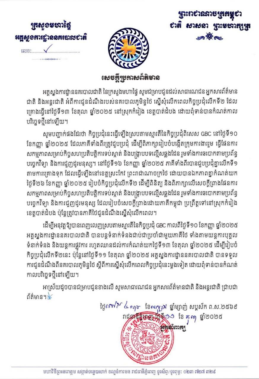 (ភ្នំពេញ)៖ អគ្គស្នងការដ្ឋាននគរបាលជាតិ នៃក្រសួងមហាផ្ទៃ សូមជម្រាបជូនដល់សាធារណជន អ្នកសារព័ត៌មានជាតិ និងអន្តរជាតិ អំពីការជូនដំណឹងរបស់នគរបាលភូមិន្ទថៃ ស្នើសុំលើកពេលកិច្ចប្រជុំលើកទី២ ដែលគ្រោង ធ្វើនៅថ្ងៃទី១៣ ខែតុលា ឆ្នាំ២០២៥ នៅស្រុកកំរៀង ខេត្តបាត់ដំបង ដោយពុំទាន់បានកំណត់កាលបរិច្ឆេទថ្មីនៅឡើយ។ នេះបើតាមសេចក្ដីជូនដំណឹង របស់អគ្គស្នងការដ្ឋាននគរបាលជាតិ។