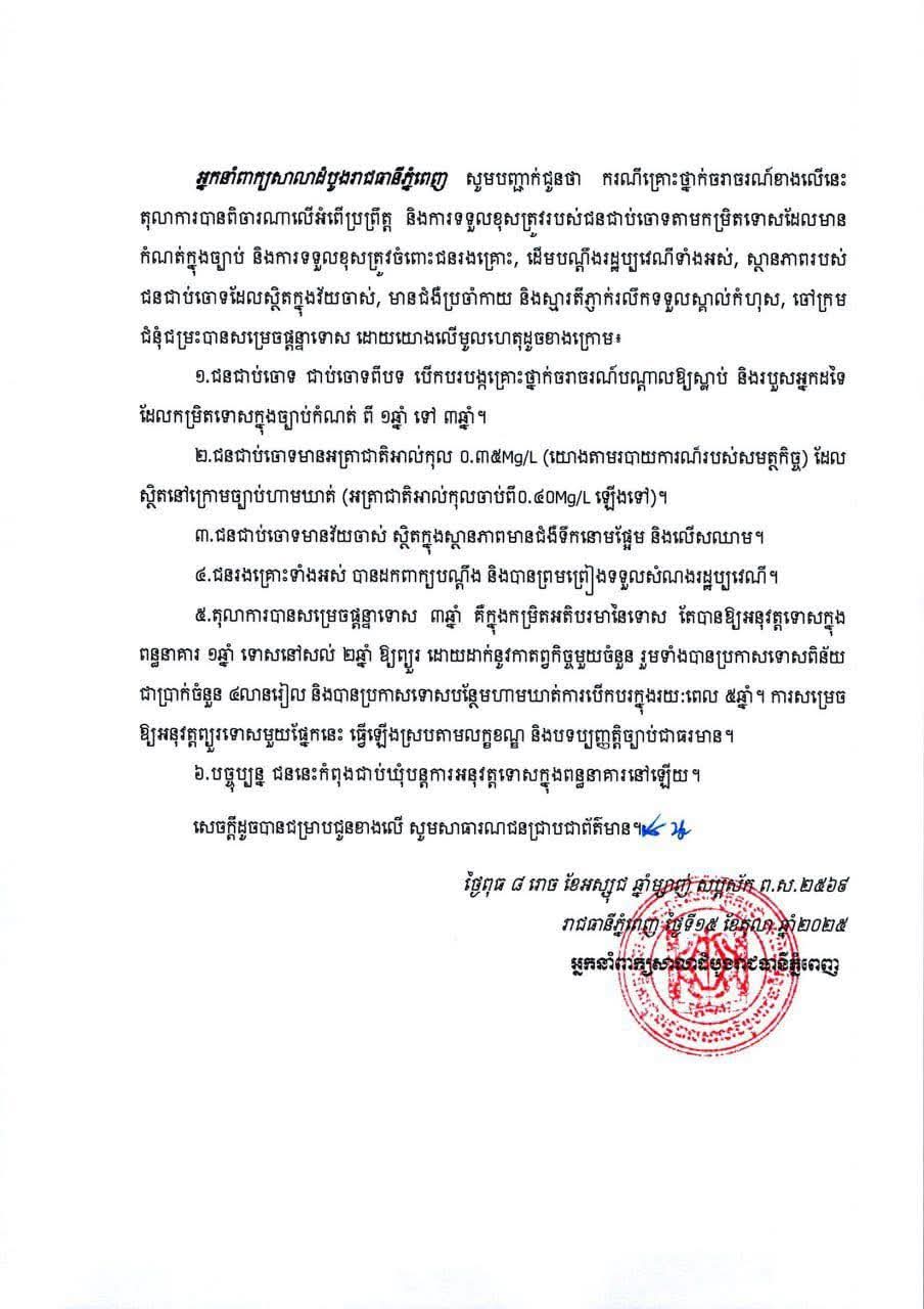 អ្នកនាំពាក្យសាលាដំបូងរាជធានីភ្នំពេញ បញ្ជាក់ថា ករណីគ្រោះថ្នាក់ចរាចរណ៍ខាងលើនេះតុលាការបានពិចារណាលើអំពើប្រព្រឹត្ត និងការទទួលខុសត្រូវរបស់ជនជាប់ចោទតាមកម្រិតទោសដែលមាន កំណត់ក្នុងច្បាប់ និងការទទួលខុសត្រូវចំពោះជនរងគ្រោះ, ដើមបណ្តឹងរដ្ឋប្បវេណីទាំងអស់, ស្ថានភាពរបស់ ជនជាប់ចោទដែលស្ថិតក្នុងវ័យចាស់, មានជំងឺប្រចាំកាយ និងស្មារតីភ្ញាក់រលឹកទទួលស្គាល់កំហុស, ចៅក្រម ជំនុំជម្រះបានសម្រេចផ្តន្ទាទោស ដោយយោងលើមូលហេតុដូចខាងក្រោម៖