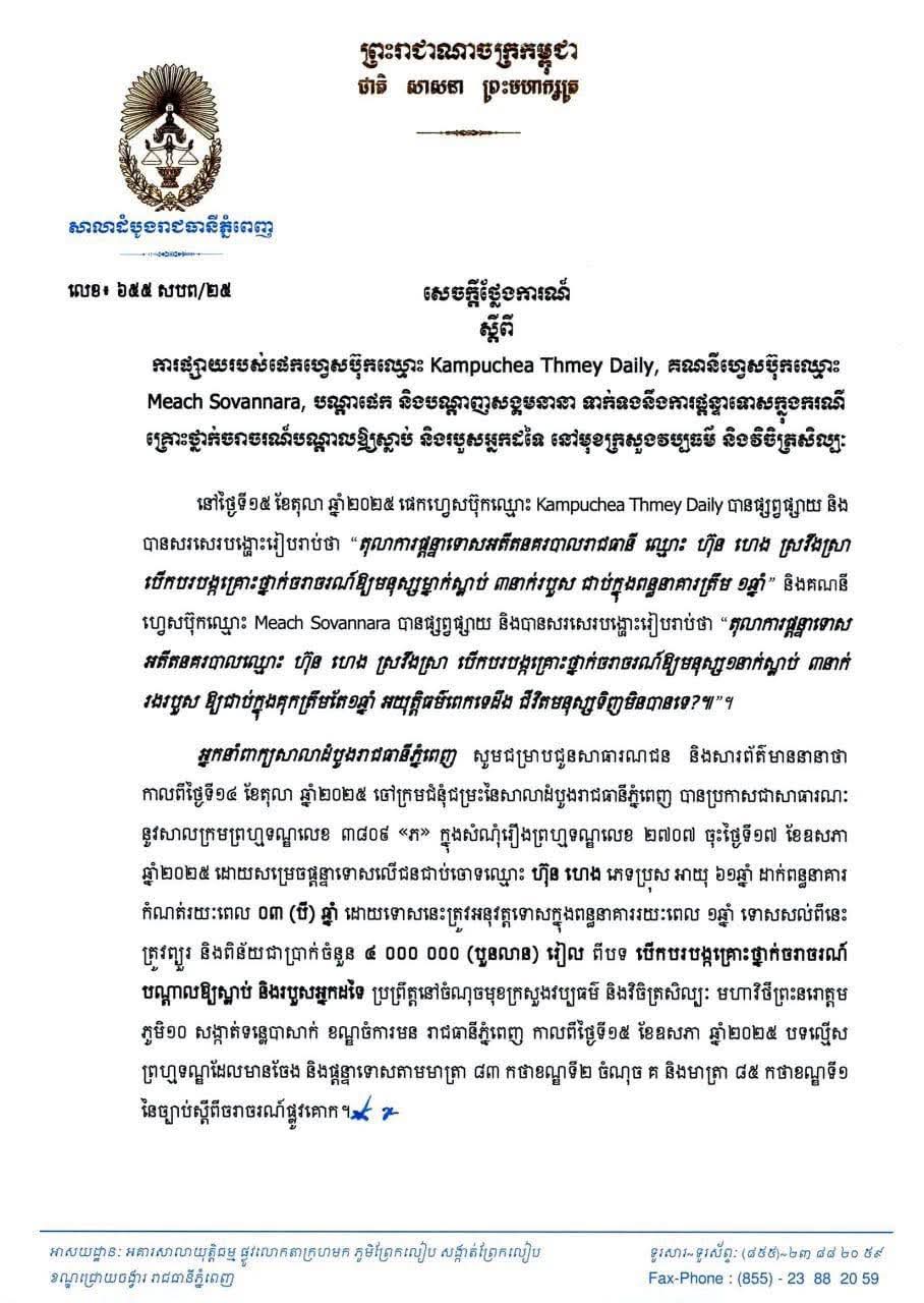 អ្នកនាំពាក្យសាលាដំបូងរាជធានីភ្នំពេញ បានគូសបញ្ជាក់ថា កាលពីថ្ងៃទី១៤ ខែតុលា ឆ្នាំ២០២៥ ចៅក្រមជំនុំជម្រះនៃសាលាដំបូងរាជធានីភ្នំពេញ បានប្រកាសជាសាធារណៈ នូវសាលក្រមព្រហ្មទណ្ឌលេខ ៣៨០៩ «ភ» ក្នុងសំណុំរឿងព្រហ្មទណ្ឌលេខ ២៧០៧ ចុះថ្ងៃទី១៧ ខែឧសភា ឆ្នាំ២០២៥ ដោយសម្រេចផ្តន្ទាទោសលើជនជាប់ចោទឈ្មោះ ហ៊ុន ហេង ភេទប្រុស អាយុ៦១ឆ្នាំ ដាក់ពន្ធនាគារ កំណត់រយៈពេល ០៣ (បី) ឆ្នាំ ដោយទោសនេះត្រូវអនុវត្តទោសក្នុងពន្ធនាគាររយៈពេល ១ឆ្នាំ ទោសសល់ពីនេះ ត្រូវព្យួរ និងពិន័យជាប្រាក់ចំនួន ៤ ០០០ ០០០ (បួនលាន) រៀល ពីបទ បើកបរបង្កគ្រោះថ្នាក់ចរាចរណ៍ បណ្តាលឱ្យស្លាប់ និងរបួសអ្នកដទៃ ប្រព្រឹត្តនៅចំណុចមុខក្រសួងវប្បធម៌ និងវិចិត្រសិល្បៈ មហាវិថីព្រះនរោត្តម ភូមិ១០ សង្កាត់ទន្លេបាសាក់ ខណ្ឌចំការមន រាជធានីភ្នំពេញ កាលពីថ្ងៃទី១៥ ខែឧសភា ឆ្នាំ២០២៥ បទល្មើស ព្រហ្មទណ្ឌដែលមានចែង និងផ្តន្ទាទោសតាមមាត្រា ៨៣ កថាខណ្ឌទី២ ចំណុច គ និងមាត្រា ៨៥ កថាខណ្ឌទី១ នៃច្បាប់ស្តីពីចរាចរណ៍ផ្លូវគោក។