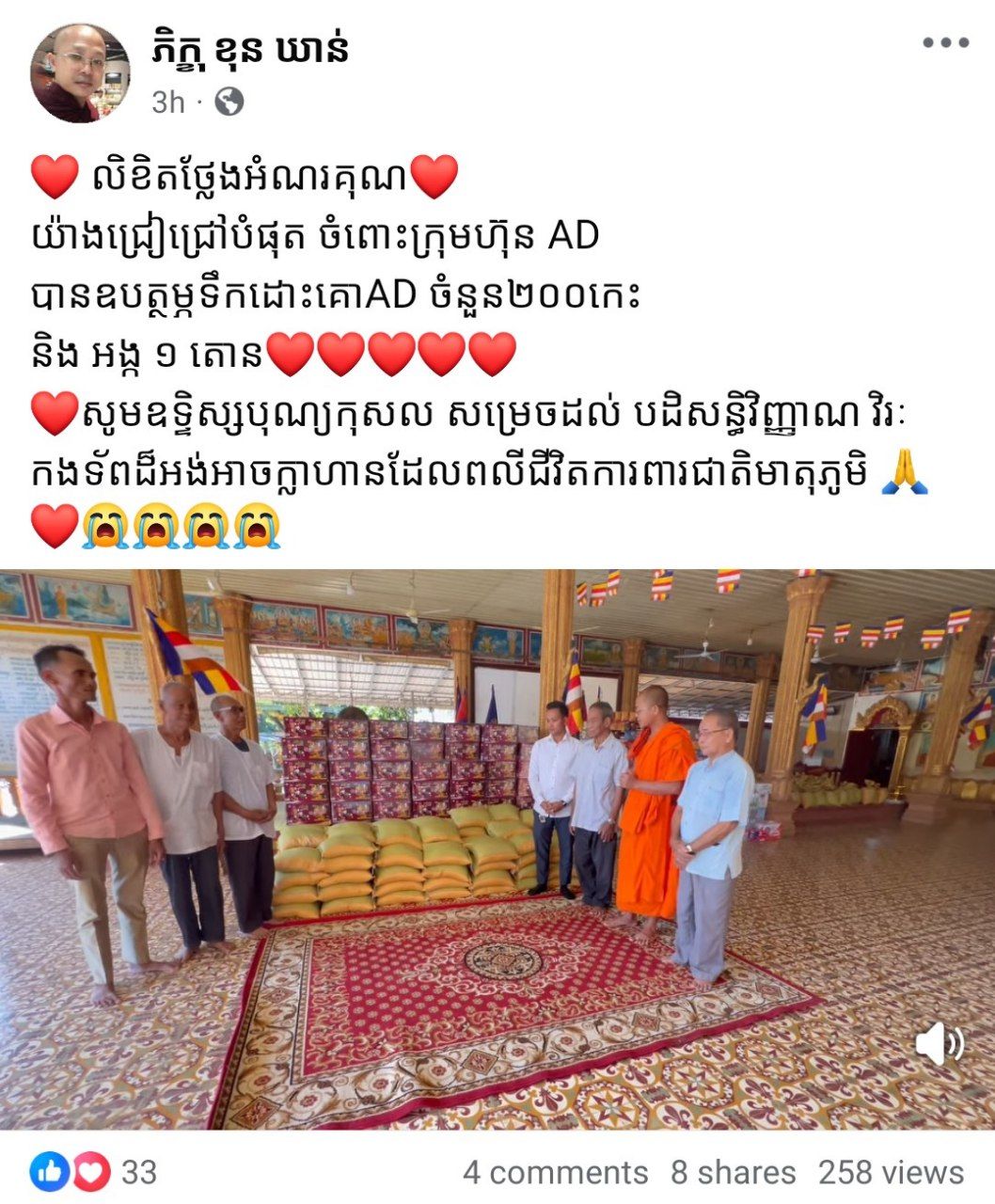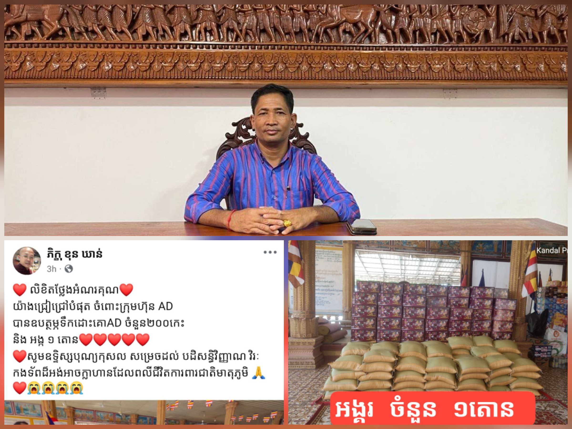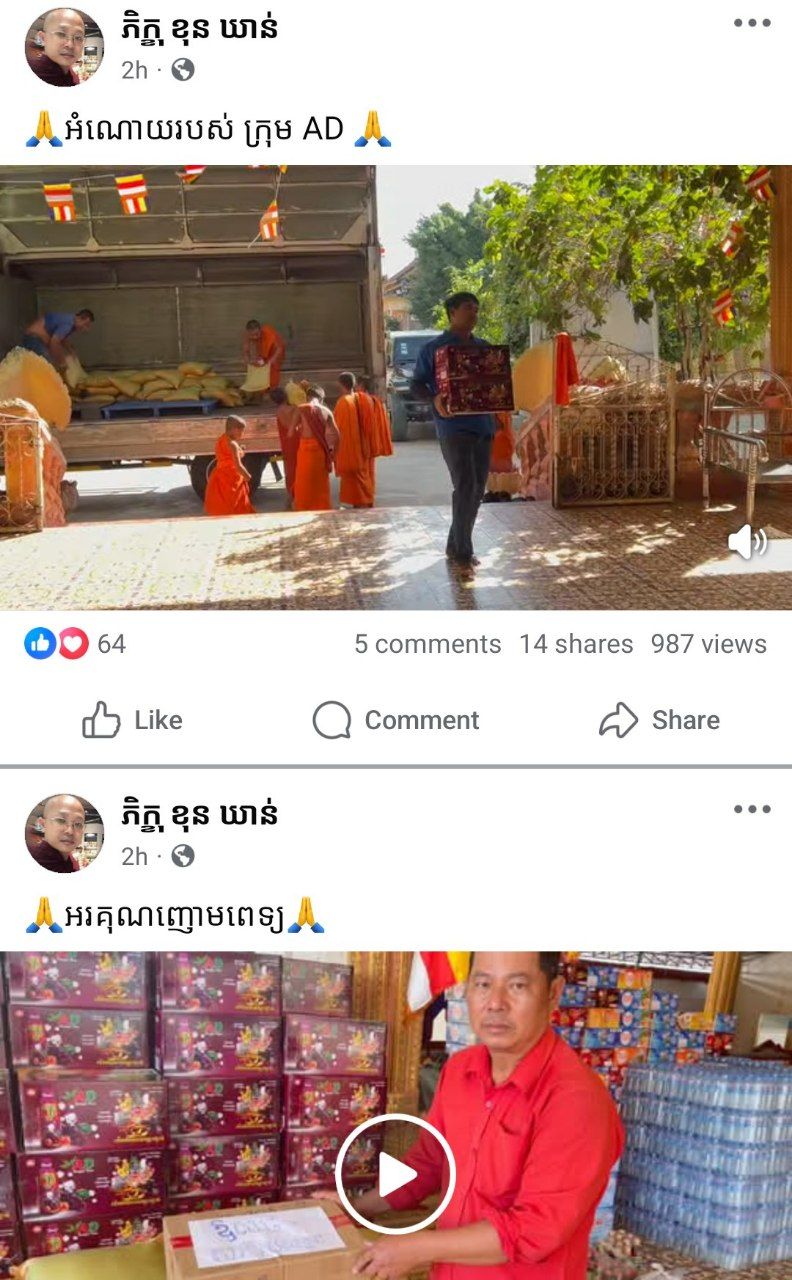 ភ្នំពេញ@.លោក ថុល ប៊ុនធឿន អគ្គនាយក នៃរោងចក្រផលិតទឹកដោះគោ AD បានចាត់តាំងតំណាង ក្រុមហ៊ុន ពាំនាំស្បៀងនិងសម្ភារៈចូលរួមចំណែកជួយកិច្ចការងារសង្គម តាមរយៈលោកចៅអធិការវត្តពោធិ៍ធិព្រឹក ព្រនាមភិក្ខុ ខុន ឃាន់ ទឹកដោះគោ “AD”ចំនួន ២០០កេះ និងអង្គរ មួយតោន ដេីម្បីយកចែកជូនបន្តដល់គ្រួសារកងទ័ព និងប្រជាពលរដ្ឋដែលកំពុងទទួលរង ជម្លៀសសឹកនៅតាមតំបន់កន្លែងមានទីទួលសុវត្ថិភាព ដោយខ្វះខាតនូវស្បៀងអាហារជាច្រើន។